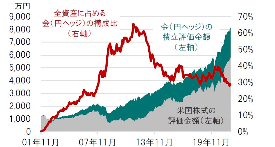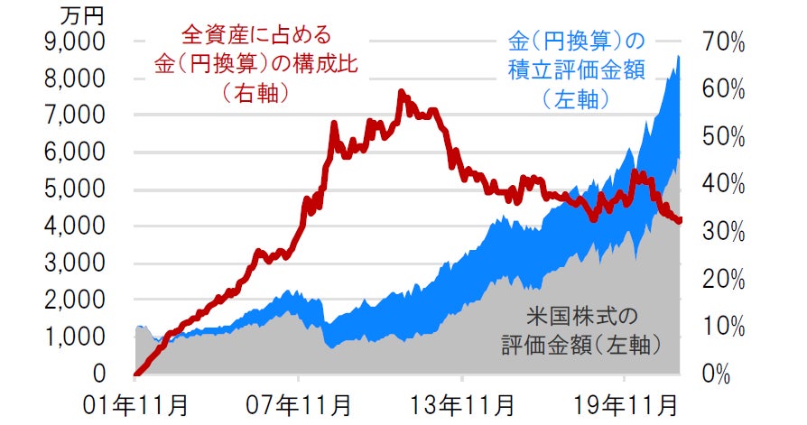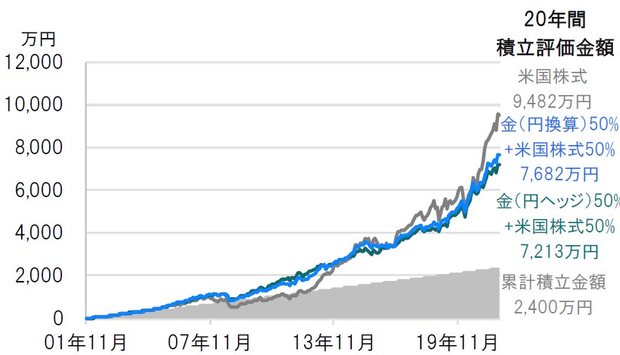 2001年11月末に米国株式に1,200万円一括投資し、同時に金(円ヘッジ/円換算)を毎月5万円、20年間積み立てた場合の投資シミュレーションが図表5、図表6です。