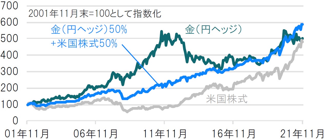 図表1:金(円ヘッジ)と米国株式、金(円ヘッジ)50%+米国株式50%の推移