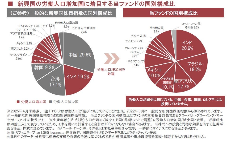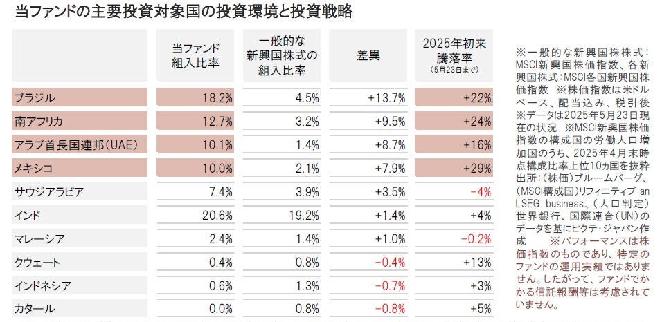 主要労働人口増加国の年初来の騰落率では(MSCI新興国株価指数の構成国の労働人口増加国、2025年4月末時点構成比率上位10ヵ国のうち)、当ファンドが一般的な新興国株式よりも、組入れを高位にしていたブラジル、南アフリカ、UAE、メキシコなどが、米ドルベースで+16~29%と上昇しました。