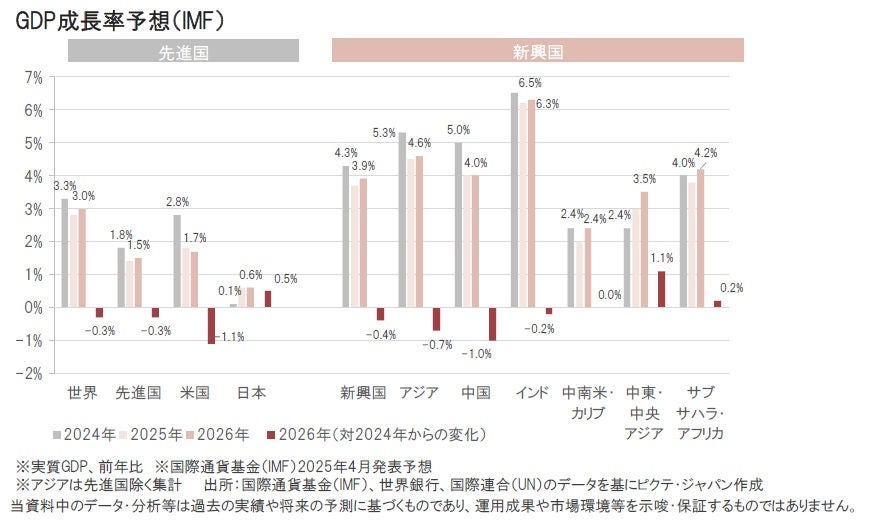 国際通貨基金(IMF)は4月に世界の経済見通しを発表し、米関税の影響を理由に米国や中国など多くの国・地域の経済成長率予測を引き下げました。米追加関税の税率の高い国や、経済への米国輸出依存度の高い国ほど、GDPの成長率予想が鈍化し、米国のGDP成長率も低下が予想されています。一方、当ファンドの投資対象である労働人口が増加しているインドや中東、アフリカ地域の国のGDP成長率も下方修正されましたが引き続き高い水準での成長が予想されています。