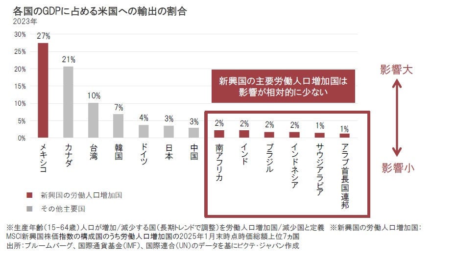 追加関税・相互関税の影響に関しては、その国のGDP(国内総生産)に占める米国への輸出の割合が高い国ほどマイナスの影響が大きくなります。新興国の労働人口増加国のGDPに占める米国への輸出の割合(2023年)はメキシコなどを除くと2%以下と低い水準です。