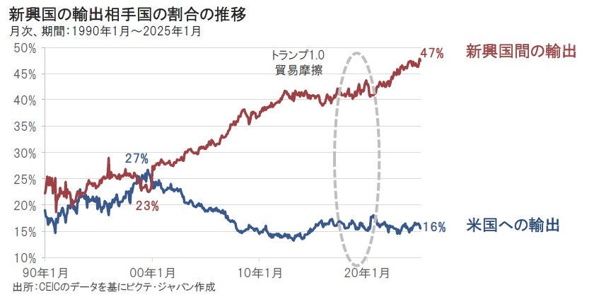 ■ 新興国の米国への輸出依存度は低下し、新興国間の貿易が拡大