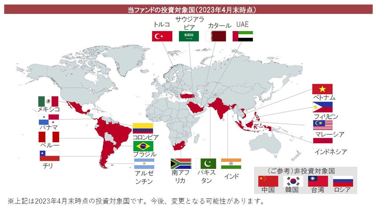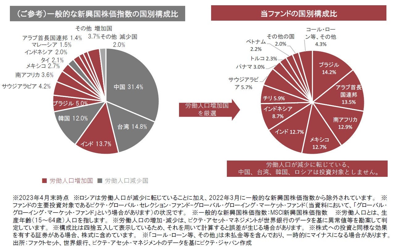 2023年4月末現在、労働人口が減少している中国・韓国・台湾・ロシアなどは投資対象外です。