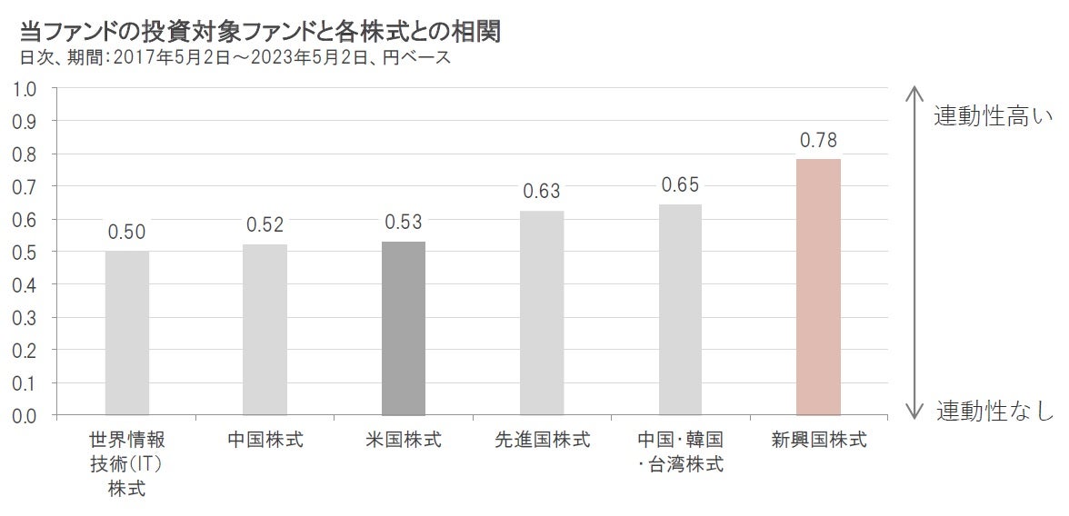 当ファンドは労働人口が増加する新興国を投資対象国としています。このため、労働人口が減少している、中国・韓国・台湾・ロシアなどは2023年4月末現在、投資対象外です。これらの国々では、地政学リスクが高まっています。また、台湾・韓国の株式市場は情報技術(IT)セクターの構成比が2023年4月末現在、それぞれ約5割、7割と相対的に高い特徴がありますが、当ファンドにおける同セクターの比率は約3%と、新興国株式全体の約20%や先進国株式の約20%と比べても低くなっています。こうした違いがあることなどから、過去の実績では、当ファンドの投資対象ファンドの値動きは中国・台湾・韓国や先進国、米国の株式市場と比較的連動性が低くなっています。(下図参照)