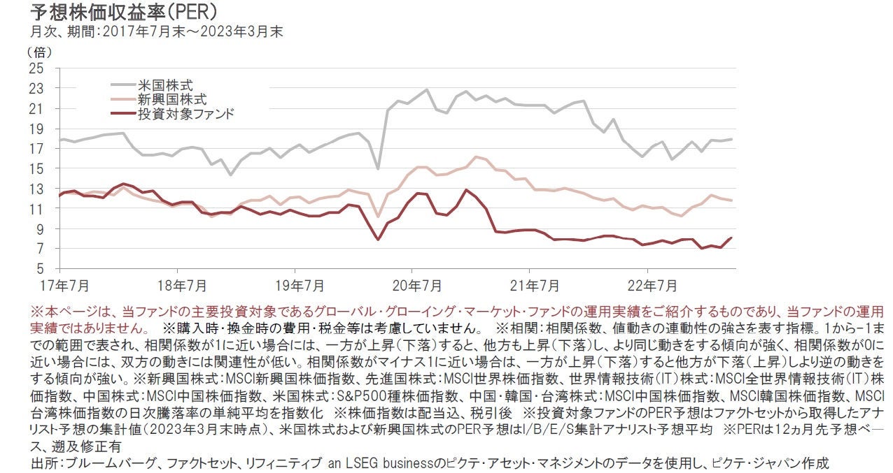 ● 投資対象ファンドの株価収益率(PER)は、過去平均や先進国株式、新興国株式平均と比べても、低い水準となっている