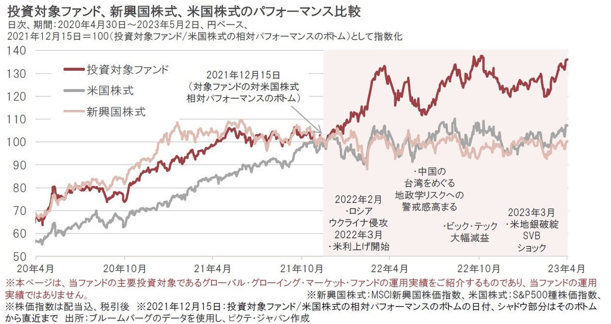 ●投資対象ファンドのパフォーマンスは2021年末以降先進国や新興国の市場平均を上回る