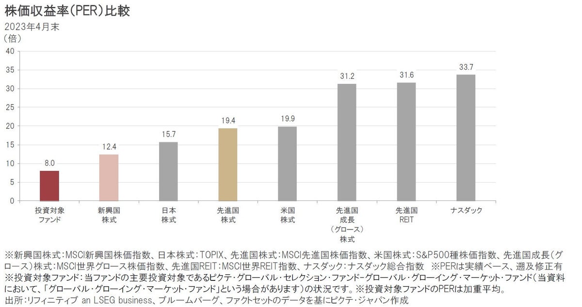 新興国株式のPERは、12.4倍(2023年4月末)と他の株式やREITと比べて低い水準です。当ファンドの投資対象のPERは、8.0倍とさらに低い水準です。
