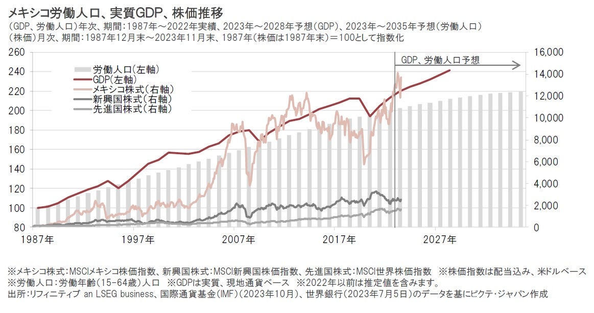 労働人口の増加は、生産活動や消費拡大につながり、経済成長や株価の上昇に寄与すると考えられます。過去の実績では、メキシコは、労働人口の増加とともに、GDPが拡大し株価も上昇してきました。メキシコでは、今後も2035年に向けて、労働人口は増加すると予想されています(世界銀行予想)。