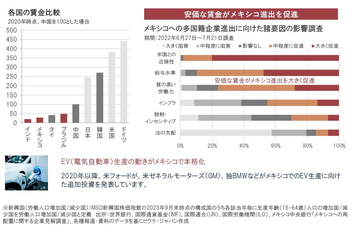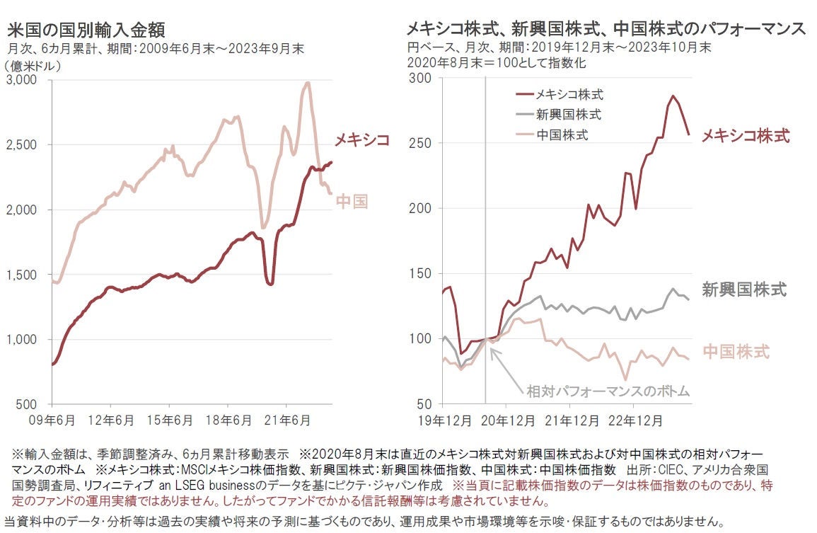 2023年上期(1-6月)には米国の国別輸入金額(6カ月累計)において、メキシコが中国を抜き、首位となり、足元(2023年9月)でも中国を上回って推移しています。米中対立を背景に、米国が進める友好国とのサプライチェーン(供給網)構築が、メキシコからの輸入拡大の追い風とみられます。