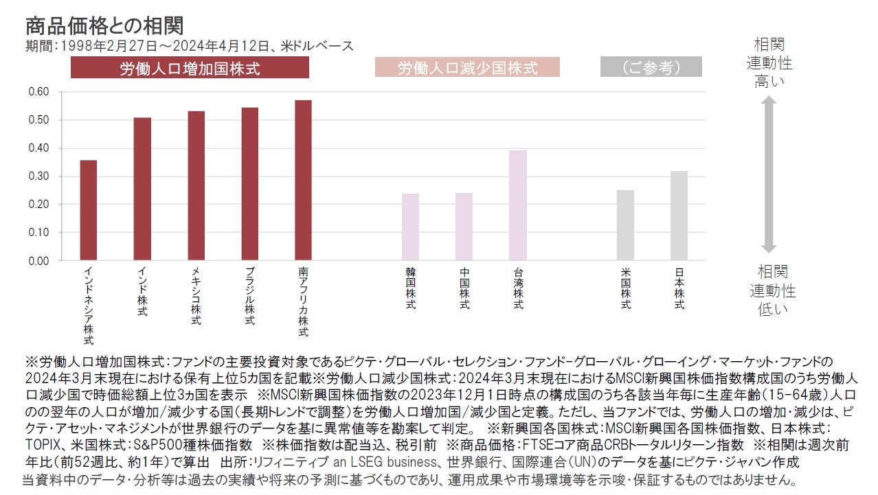 新興国の国別の株価指数と商品価格との相関を見ると、労働人口が増加している新興国の株式の方が商品価格との連動性が相対的に高い傾向にあるため、商品価格が上昇した場合は、これらの国の株式のパフォーマンスにプラスに寄与するものと期待されます。