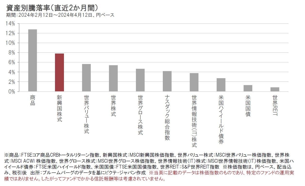 新興国株式は、足元2ヵ月間(2024年2月12日から4月12日)で、他の資産に比べて上昇率が高くなり、世界株式を上回る上昇となりました。この期間、上昇率が最も高かったのは商品指数で、それに続いて新興国株式、世界バリュー株式など、商品価格と連動する傾向がある資産が続きました。
