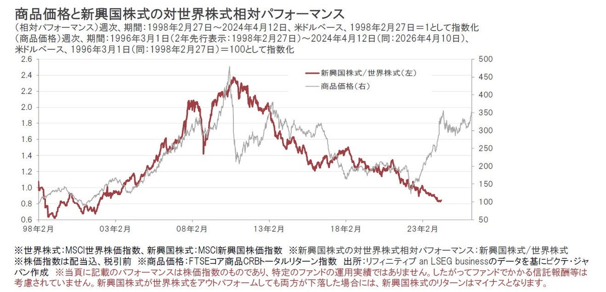過去の傾向としては、商品価格(2年先行)と新興国株式の世界株式に対する相対パフォーマンスが同じような動きをしていました。つまり、商品価格が上昇するとその後、新興国株式のパフォーマンスが世界株式のパフォーマンスを上回って推移し、商品価格が下落するとその後、新興国株式のパフォーマンスが世界株式のパフォーマンスを下回って推移する傾向があったということを示します。
