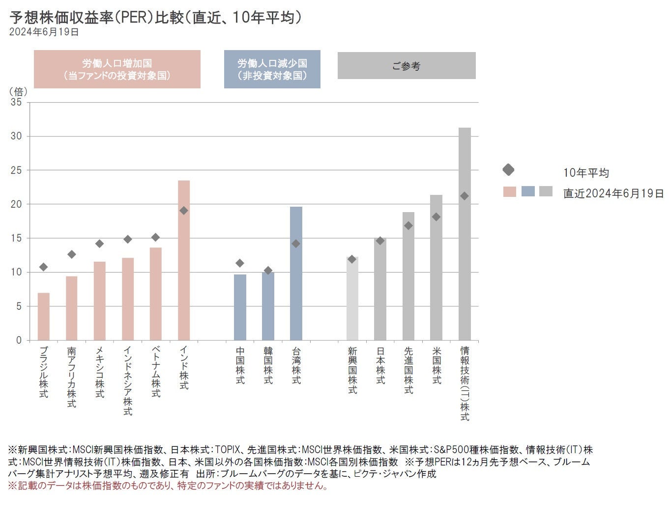 多くの新興国の労働人口増加国株式の株価収益率(PER)は、現在、過去平均や先進国株式や米国株式などと比較しても、低い水準にとどまっている国が多くなっています。そのため、足元のような株価の軟調な局面は、中長期的な投資機会を提供するものと考えます。