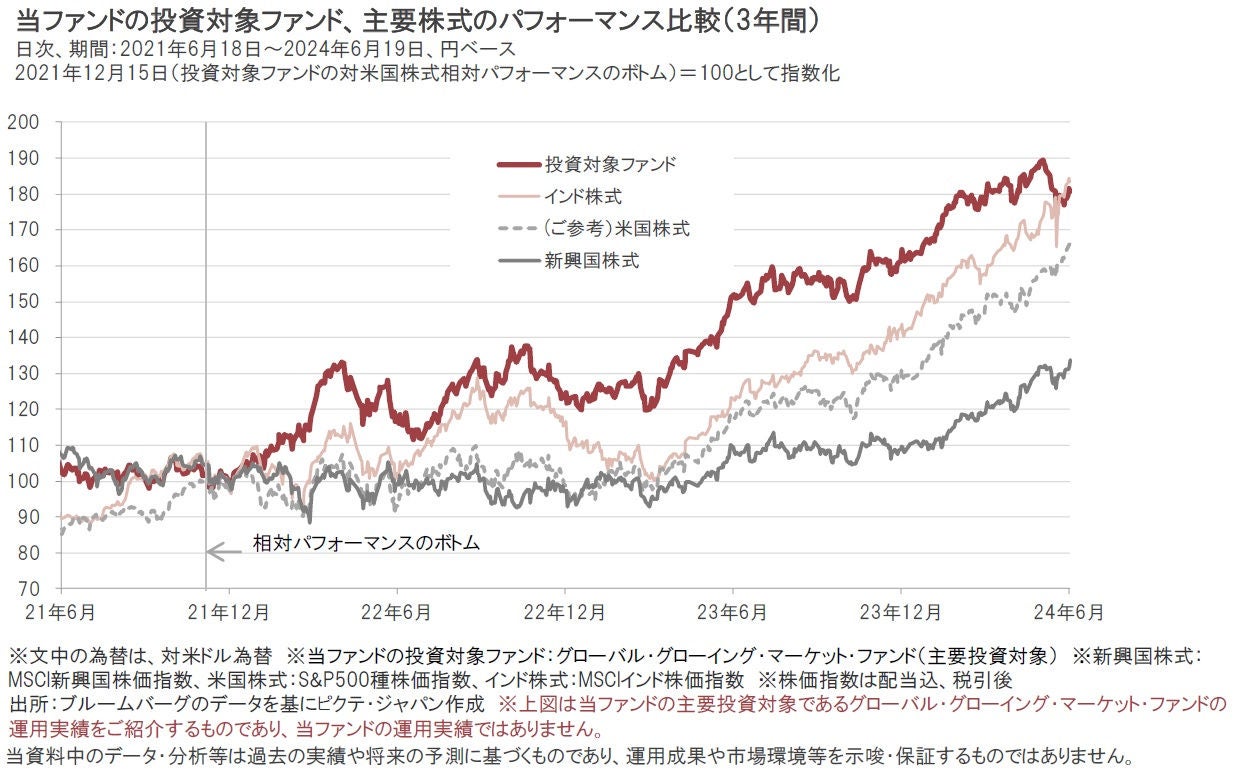 当ファンドの投資対象ファンドは過去3年間(2021年6月18日から2024年6月19日)の実績でみると、 2021年12月15日を対米国株式の相対パフォーマンスのボトムに、米国株式や、新興国株式を上回って上昇してきました。