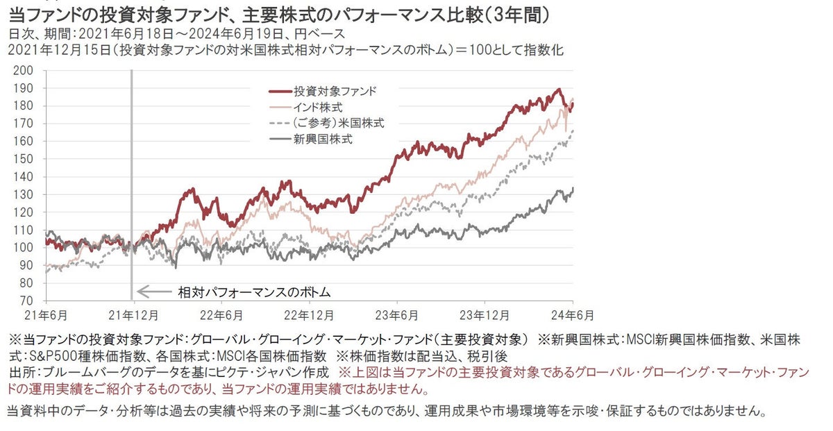 当ファンドの投資対象ファンドは過去3年間(2021年6月18日から2024年6月19日)の実績でみると、 2021年12月15日を対米国株式の相対パフォーマンスをボトムに、米国株式や、新興国株式を上回って上昇してきました。