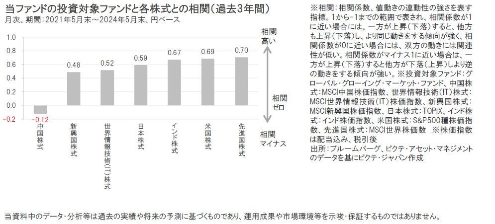 当ファンドは労働人口が増加する国を投資対象国としています。このため、労働人口が減少している、中国・韓国・台湾・ロシアなどは2024年5月末現在、投資対象外です。また、当ファンドの情報技術(IT)セクターの比率は約6%と、一般的な新興国株価指数(MSCI新興国株価指数)の23%や先進国株式(MSCI世界株価指数)の24%と比べても低くなっています(2024年5月末現在)。こうした違いなどから、過去の実績では、当ファンドの投資対象ファンドの値動きは情報技術(IT)株式の割合が比較的大きい主要株式と連動性が低い傾向が見られます。このため、こうした株式と組み合わせることで分散効果が期待されます。