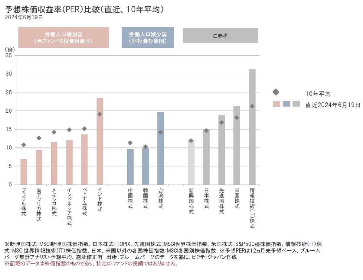 地政学リスクの高まり、米国の金融政策動向、主要新興国の政治動向などが金融市場のボラティリティ(価格変動)を高める要因となる可能性も考えられますが、市場の調整局面でも、中長期的に高い経済成長への期待などを背景に、労働人口が増加している新興国の株式の株価収益率(PER)縮小のリスクは比較的小さいとみており、中長期的な投資機会となる可能性があるとみています。