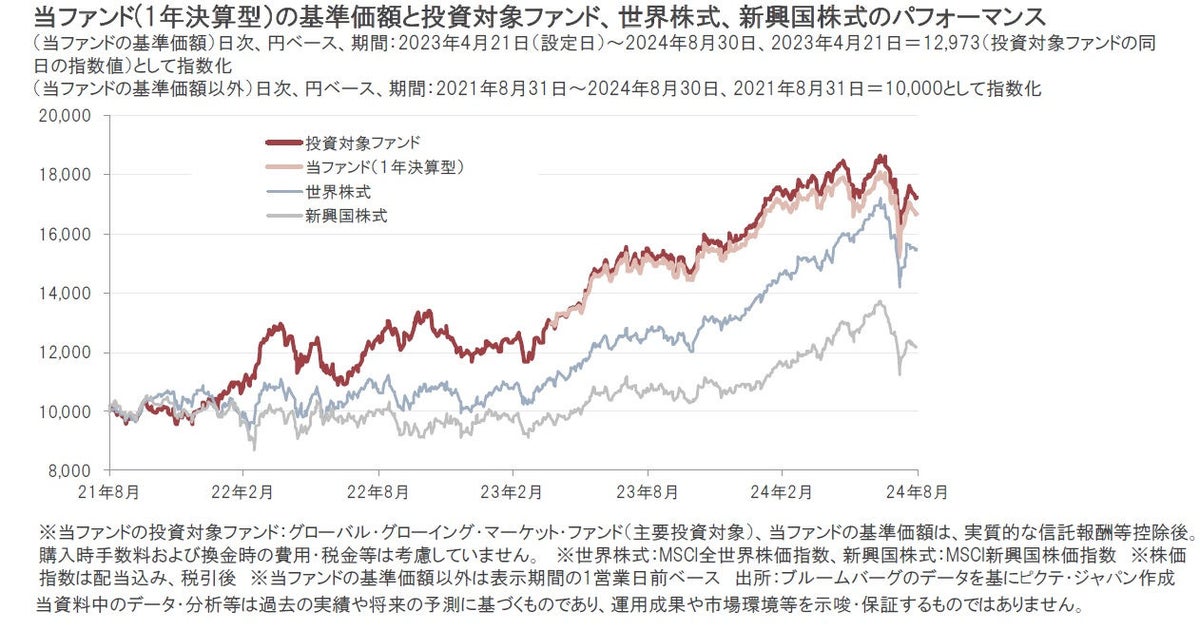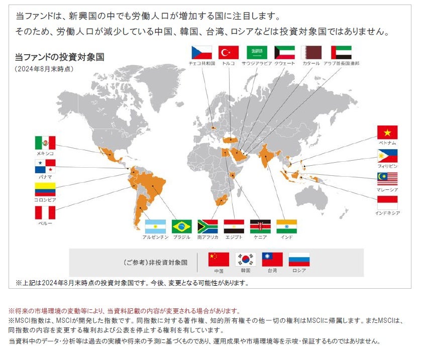 新興国の労働人口増加国の株式に投資する当ファンドの投資対象ファンドの過去3年間の実績では、投資対象株式の相対的に高い利益成長率などを背景に世界株式や新興国株式をアウトパフォームしてきました。足元では、世界の株式市場は、弱い米経済指標の発表を受けて景気減速懸念が高まり、8月に入り急落、その後、米国の景気後退懸念が一旦落ち着いたことやインフレ指標の鈍化を受けて米国やユーロ圏で利下げが示唆されたことなどを背景に、反発しています。為替は日銀の追加利上げを受けて、円高が進行しました。こうしたなか、当ファンドの基準価額も値動きが大きくなっています。