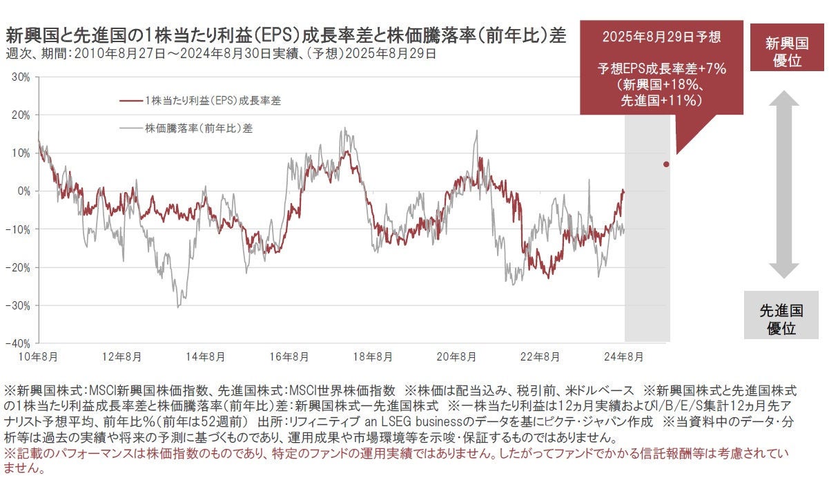 過去の実績では、新興国株式と先進国株式の1株当たり利益(EPS)成長率差と株価の相対パフォーマンスは概ね連動する傾向がみられました。今後、新興国の方が、EPS成長率が高くなり、先進国とのEPS成長率の格差が拡大すると予想されていることから、新興国株式の相対パフォーマンスが優位になる可能性があるとみられます。