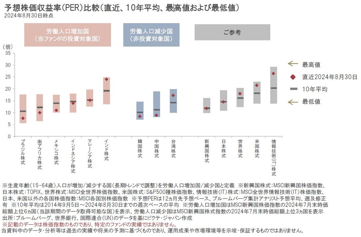 新興国の労働人口増加国株式の多くで、株価収益率(PER)が、現在、過去10年の平均や世界株式や米国株式などと比較して、低い水準となっています。