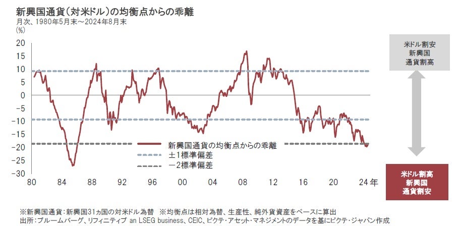 ピクテが算出している新興国通貨の均衡点からの乖離でみると米ドルは割高、新興国通貨はおよそ40年来の割安水準です。