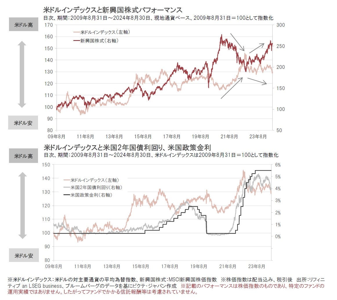 今後、新興国株式に追い風となる可能性があると考えられるのが、米国金利の低下と米ドル安です。 過去の実績では、米国金利が低下時に、米ドル安が進行する傾向がみられました。そして、米ドル安が進行すると、新興国株式はより上昇する傾向がありました。
