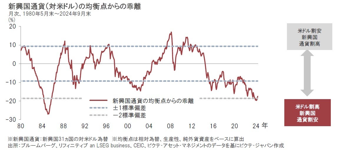 ピクテが算出している新興国通貨の均衡点からの乖離でみると米ドルは割高、新興国通貨はおよそ40年来の割安水準です。新興国通貨は資源価格との連動性が高いことから、資源価格が上昇トレンドに向かうと、新興国通貨の上昇要因となるとみられます。
