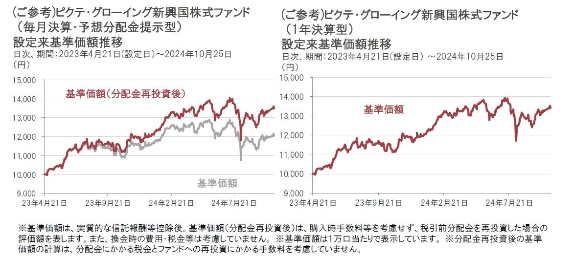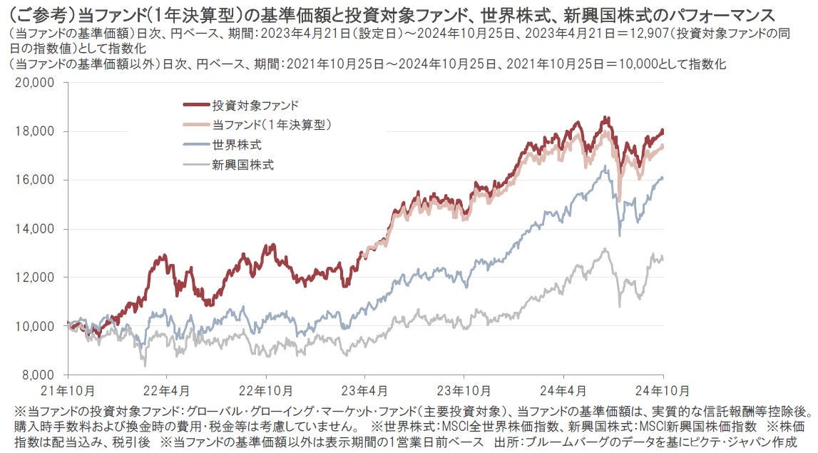 世界の株式市場は、弱い米経済指標の発表を受けて景気減速懸念が高まり8月には急落しました。その後、インフレ指標が鈍化するなか9月には米連邦準備制度理事会(FRB)が4年半ぶりとなる利下げに踏み切ったことなどから、新興国株式をはじめとしたリスク資産への投資意欲が改善し、反発しています。米大統領選を前に、関税問題や米金利動向などを背景に世界の株式市場は、値動きが大きくなっており、当ファンドの基準価額も値動きが大きくなっています。