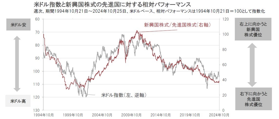 今後、新興国株式をみるうえで重要なポイントの一つは、米国金利の低下と米ドル安です。 過去の実績では、米国金利低下時に、米ドル安が進行する傾向がみられました。そして、米ドル安が進行すると、新興国株式は先進国株式のパフォーマンスを上回る傾向がみられました。