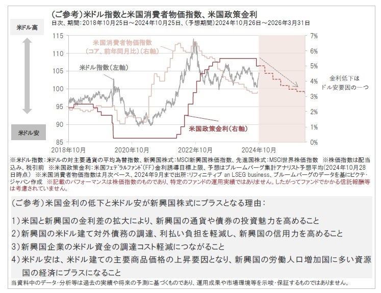 米国の連邦準備制度理事会が政策金利を決定する際に注目している指標の一つであるインフレ率が鈍化傾向となる中、市場では米国の政策金利引き下げを見込んでいます。これに伴い米国の市場金利が低下すると米ドル安要因の一つとなることから、新興国株式にとって支援材料となると期待されます。