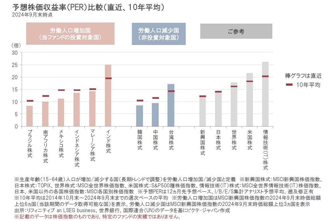 新興国の労働人口増加国株式の多くで、バリュエーションの一つである株価収益率(PER)は、現在、過去10年の平均や世界株式や米国株式などと比較して、低い水準となっています。
