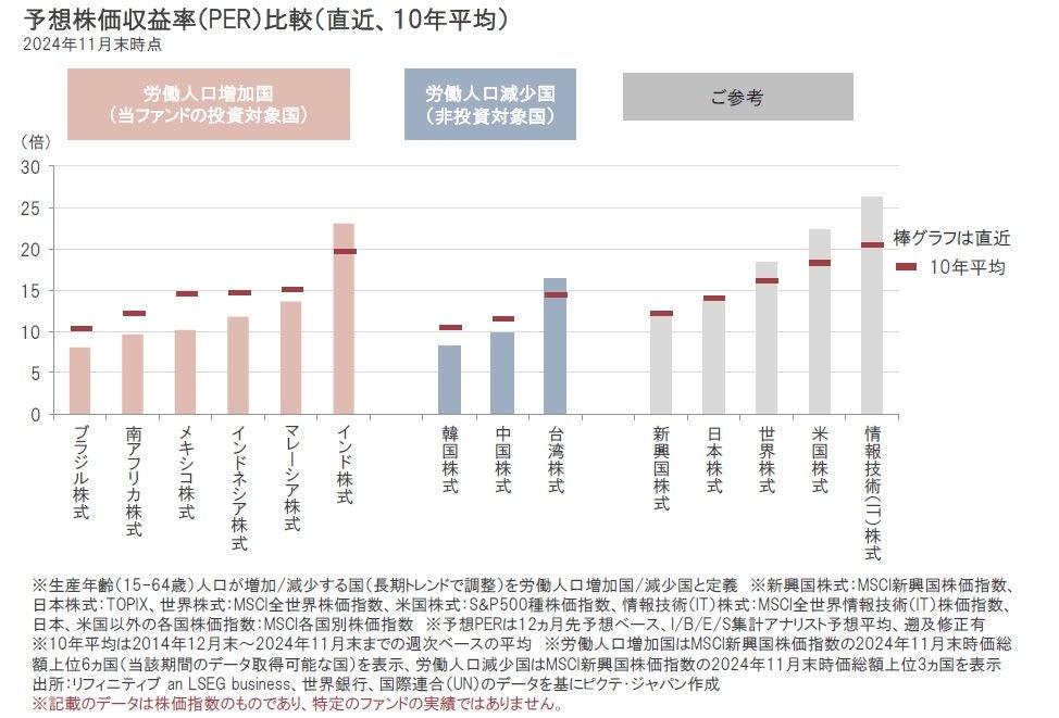 新興国の労働人口増加国株式の多くで、バリュエーションの一つである株価収益率(PER)は、現在、過去10年の平均や世界株式や米国株式などと比較して、低い水準となっています。