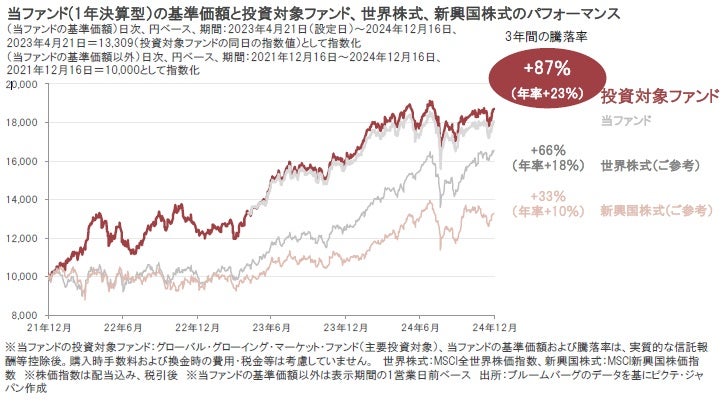 過去3年間の実績では、当ファンドの投資対象ファンドのパフォーマンスは、全世界株式や新興国株式平均を上回って推移しました。