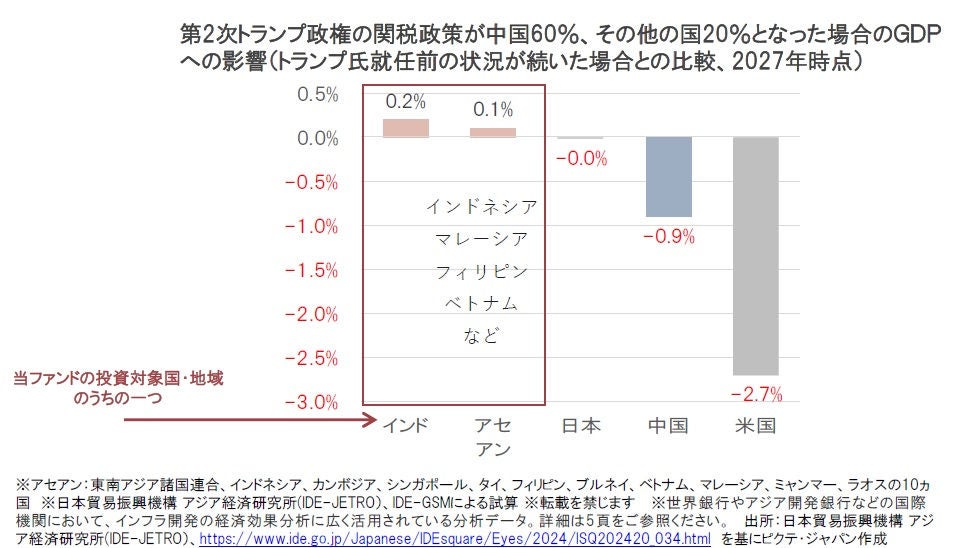 米国大統領選で勝利したトランプ氏は、対中関税の大幅引き上げや隣国のメキシコ・カナダへの関税引き上げなどを表明しており、今後暫く、標的となった国を中心に、金融市場のボラティリティ(価格変動)が高まる可能性があります。ただし、トランプ政権の1期目の関税交渉では、早期に通商問題などについて譲歩を行い、最悪の事態を回避しようとした国もあり、最終的に課された関税は、初期に提示されたものよりも穏やかでした。ただし、中国などはトランプ政権が仕掛ける通商戦争の直撃を受ける可能性があるとみています。一方、中長期的には新興国の労働人口増加国を中心に、標的となった国からの回避やサプライチェーンの分散化の動きなどにより、好影響をうける可能性があり、短期的な株価の調整は、当ファンドの投資対象国の株式に、中長期的な投資機会を提供するものとみています。