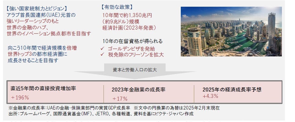 【明確なビジョン】 UAEは石油のみに依存せず、 国際競争を勝ち抜くために、2023年に、向こう10年間で約9兆ドル(約1,350兆円)規模の経済計画を掲げており、経済規模を倍増し、金融のハブ、世界のイノベーション拠点都市として、世界トップ3の都市経済圏になることを目指しています。