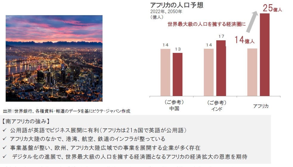 2019年に、南アフリカが議長国となり、アフリカ大陸での単一市場の実現を目指す、アフリカ大陸自由貿易圏(AfCFTA)が創設され、2021年に運用が開始されました。域内関税を引き下げること等により、域内での貿易が活性化し、工業化の進展が期待されています。2022年の域内の人口は中国やインドに匹敵する約14億人です。アフリカの人口は今後も拡大が見込まれており、2050年に約25億人に達し、世界人口の約4分の1を占める経済圏になると予想されています*。労働人口の増加が、工業化の進展や消費の拡大を後押しすると期待され、現在のGDPの総計は約2.9兆ドルですが、2028年には4兆ドルを上回ると予想されています**。南アフリカは、その中心的存在になると期待されています。 *世界銀行予想集計 **国際通貨基金(IMF)予想