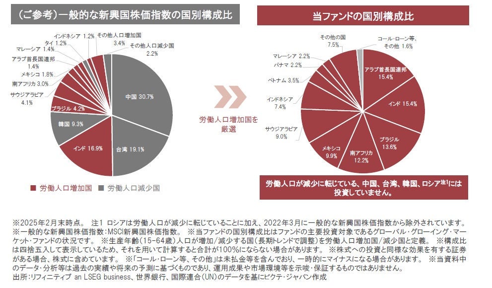 当ファンドでは、新興国の労働人口増加国の株式市場の銘柄について、詳細な分析を行い、バリュエーション(投資価値評価)等を勘案し、中長期的な業績成長が期待される銘柄を選別しています。
