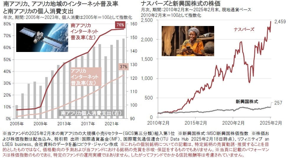 同社は、アフリカにおけるインターネット普及率の拡大によって加速する、南アフリカをはじめとするアフリカ諸国の消費拡大の恩恵を受けると期待されます。世界的にテック関連銘柄のバリュエーションが上昇するなか、同社の2025年2月末の予想株価収益率(PER)12.1倍と魅力的な水準となっています。