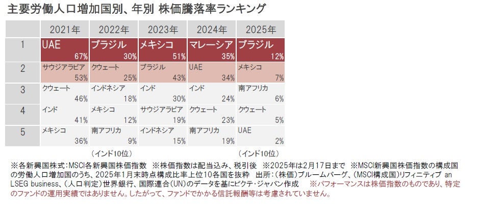 下の図は、新興国の主要労働人口増加国10ヵ国のうち、各年毎の株価騰落率上位5ヵ国を抜粋したものです。