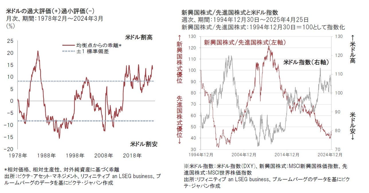 米ドルは過去の水準からの乖離でみると過大評価されているとみられます。過去の実績では、米ドル安が進行する局面では、新興国株式が先進国株式に対してアウトパフォームする傾向がみられます。