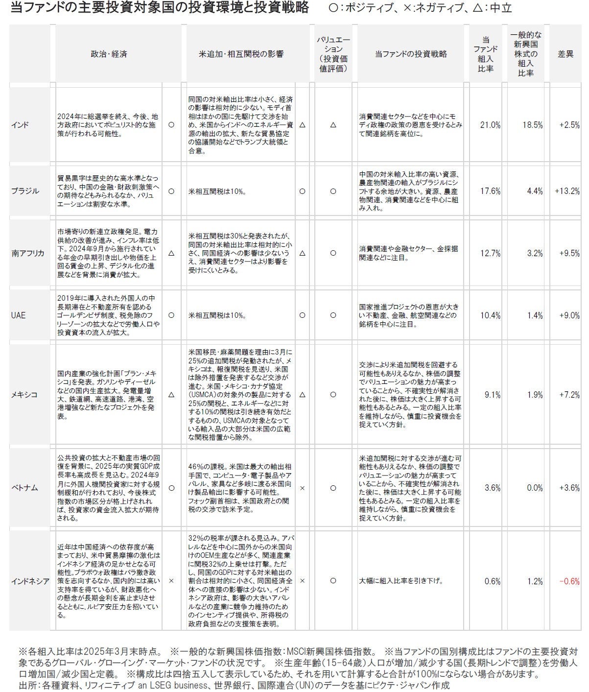 国別配分に関しては当ファンドは米関税引き上げの影響が懸念されるアジアの投資比率を低位とし、影響が相対的に小さい中南米や中東・アフリカを高位としています。