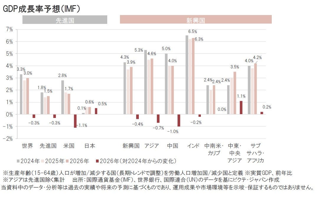 国際通貨基金(IMF)は4月に世界の経済見通しを発表し、米関税の影響を理由に米国や中国など多くの国・地域の経済成長率予測を引き下げました。米追加関税の税率の高い国や、経済への米国輸出依存度の高い国ほど、GDPの成長率予想が鈍化し、米国のGDP成長率も低下が予想されています。一方、当ファンドの投資対象である労働人口が増加しているインドや中東、アフリカ地域の国のGDP成長率も下方修正されましたが引き続き高い水準での成長が予想されています。