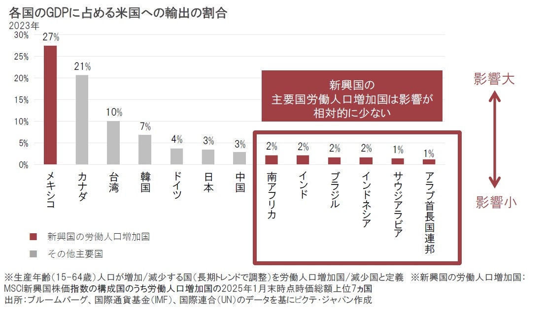 ■ 新興国の労働人口増加国には相互関税の影響が相対的に限ぎられると見られる国が多い~低い米国輸出への経済の依存度