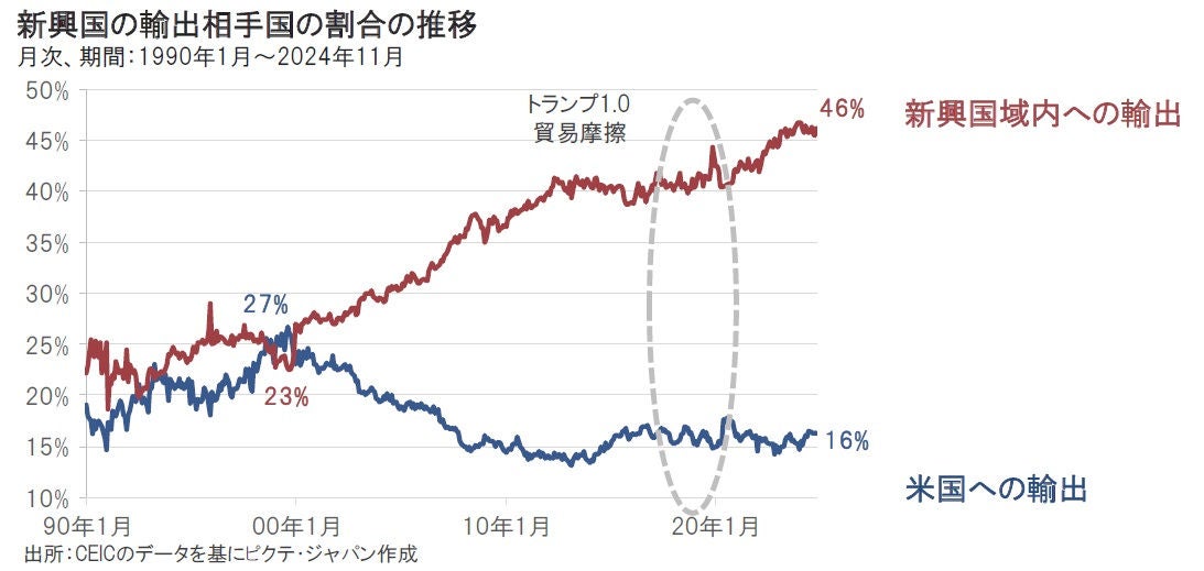 新興国全体での米国への輸出割合は1999年8月の27%をピークに2024年11月の16%まで低下する一方、新興国域内での貿易は同23%から46%まで拡大し、米国への輸出依存度は低下しています。トランプ1.0下での米中貿易摩擦が悪化した際には、新興国の米国への輸出は横ばいとなりましたが、新興国域内への輸出は拡大しました。新興国経済は、世界のGDPに占める割合でみると1999年から2024年までの25年間で20%から41%へと倍近く拡大する一方、米国は29%から27%へ低下し、新興国全体の経済は米国を凌ぐ規模となっており、今後も拡大が予想されています。(出所:国際通貨基金(IMF))