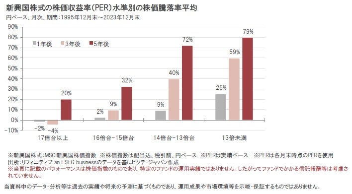 新興国株式のPERの水準別にその後の株価騰落率をみると、過去の実績ではPERの水準が低いほど、その後の株価上昇率が高くなっています。2023年12月末の新興国株式のPERは14.5倍です。過去の実績(1995年12月末~2023年12月末)で14倍台~13倍台をつけたときには、株価は1年後の平均で9%、3年後で同40%、5年後で同72%上昇しています。