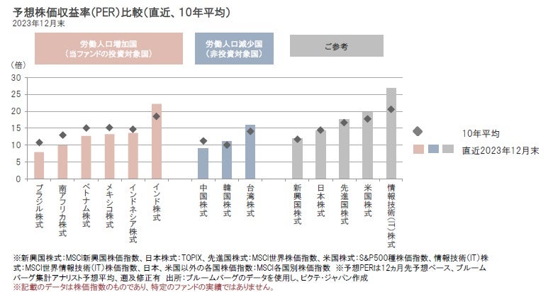 ●労働人口増加国を投資対象する当ファンドの予想株価収益率(PER)は相対的に低い水準