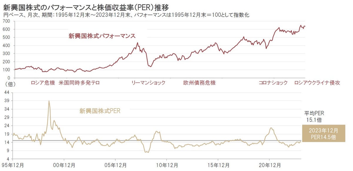 ここでは、新興国の全般的な株価と株価収益率(PER)の関係を見てみます。新興国は先進国を上回る経済成長が予想されるなか、新興国株式のPERは、過去平均(1995年12月末~2023年12月末)水準となっています。新興国株式は、堅調な業績が継続する一方、株式市場では米国のテクノロジーセクターなどの成長株が注目を集めるなかで見過ごされてきたため、PERは大きく上昇していません。