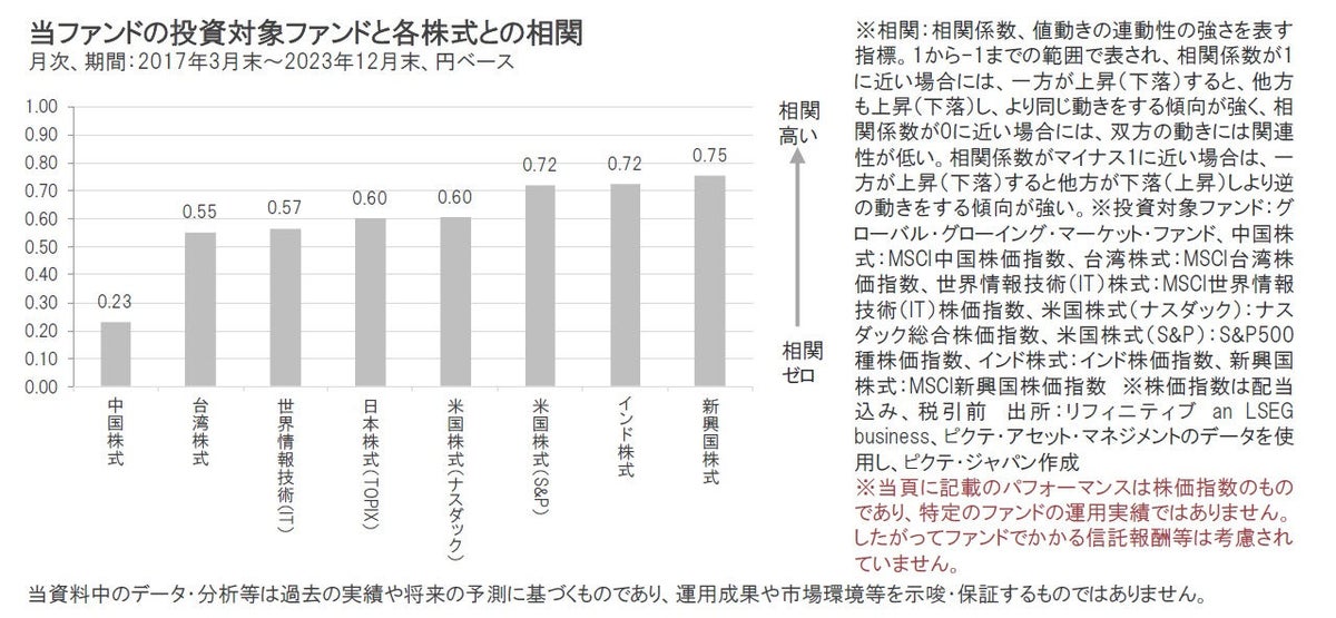 当ファンドは労働人口が増加する国を投資対象国としています。このため、労働人口が減少している、中国・韓国・台湾・ロシアなどは2023年12月末現在、投資対象外です。また、当ファンドの情報技術(IT)セクターの比率は約8%と、一般的な新興国株価指数(MSCI新興国株価指数)の22%や先進国株式(MSCI世界株価指数)の23%と比べても低くなっています(2023年12月末現在)。こうした違いなどから、過去の実績では、当ファンドの投資対象ファンドの値動きは中国、台湾、情報技術(IT)株式、米国株式などと連動性が低い傾向が見られます。このため、こうした株式と組み合わせることで分散効果が期待されます。