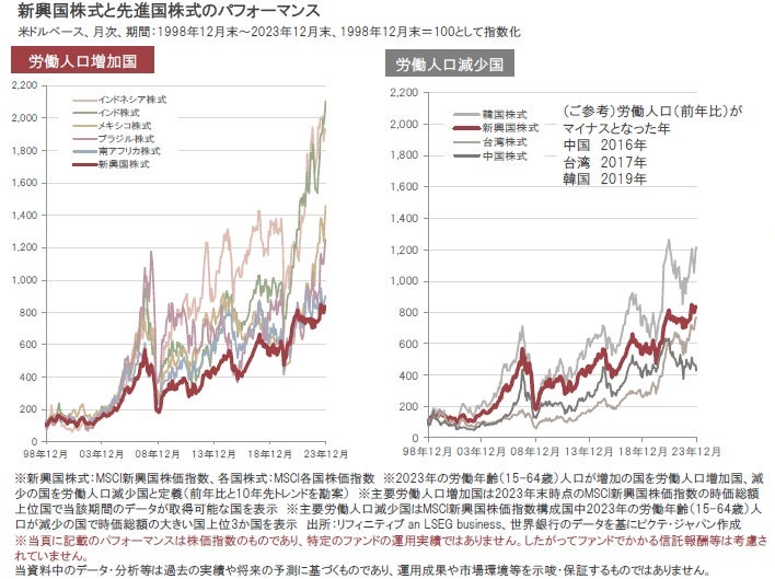 ●労働人口増加国の株価は中長期的に新興国平均を上回って推移