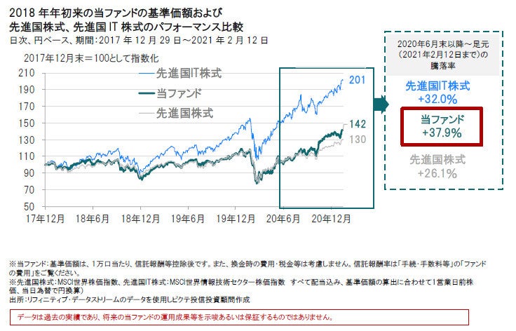 さらに、2020年後半以降は、これまで株式市場を大きくけん引してきたハイテク関連の先進国IT株式(MSCI世界情報技術セクター株価指数、円換算ベース)に比べても、当ファンドのパフォーマンスは良好なパフォーマンスを示しました。